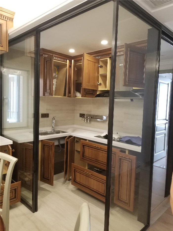 厨房是一个大学问。女人的宝地。在这个有限的地方,我特地设计了一个推拉门。在不使用厨房的情况可以完全打开,充分的利用空间。这次的旧房改造案例就介绍到这里。更多的案例请关注鑫尚设计